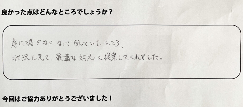 急に鳴らなくなって困っていたところ、状況を見て最適な対応を提案してくれました。